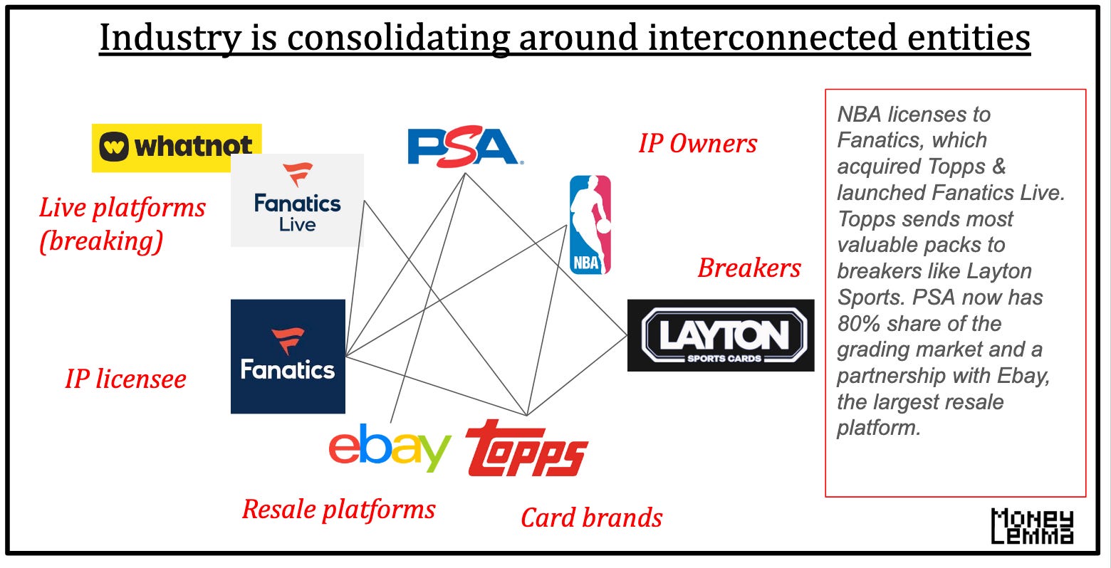That is how the trading cards industry formalized. What was once a casual, fragmented hobby grew into a large market. Large markets attract serious commercial interests. IP owners (ex. NBA), major retailers (Walmart), private-equity (PSA, Whatnot), large corporates (Fanatics), all realizing the value of sports cards, invested heavily in consolidating key nodes of the value chain. These parties then cooperated to restructure the industry to their own benefit. For example, see how interconnected the big players in the NBA trading card market are: